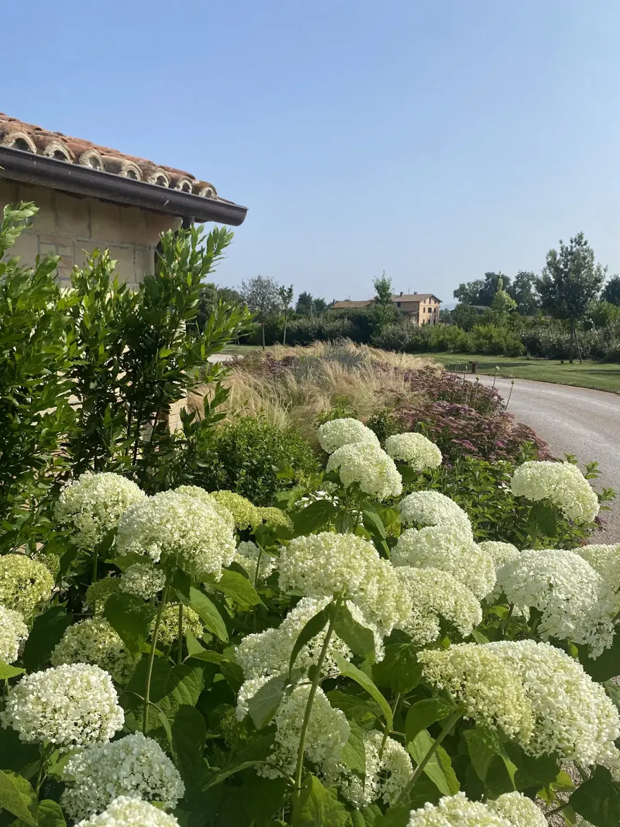 Le aiuole del giardino ospitano un ricco assortimento di essenze ornamentali come Lavandula angustifolia, Rosmarinus officinalis, rose, Hydrangea quercifolia, H. paniculata, H. arborescens, Spiraea japonica, Agapanthus africanus, in un equilibrio armonico tra fioriture stagionali e masse verdi strutturate.