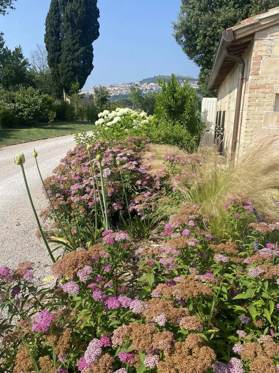 Il viale d’ingresso accoglie con una composizione scenografica: da un lato, essenze mediterranee e fioriture profumate accompagnano naturalmente lo sguardo verso la vista su Assisi; dall’altro, aiuole di Rosa chinensis mutabilis, Prunus triloba e Cercis siliquastrum conferiscono ritmo e movimento al percorso.