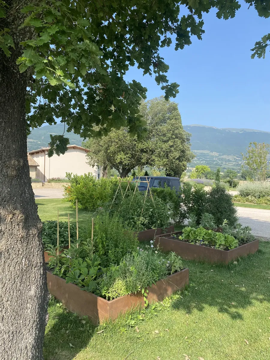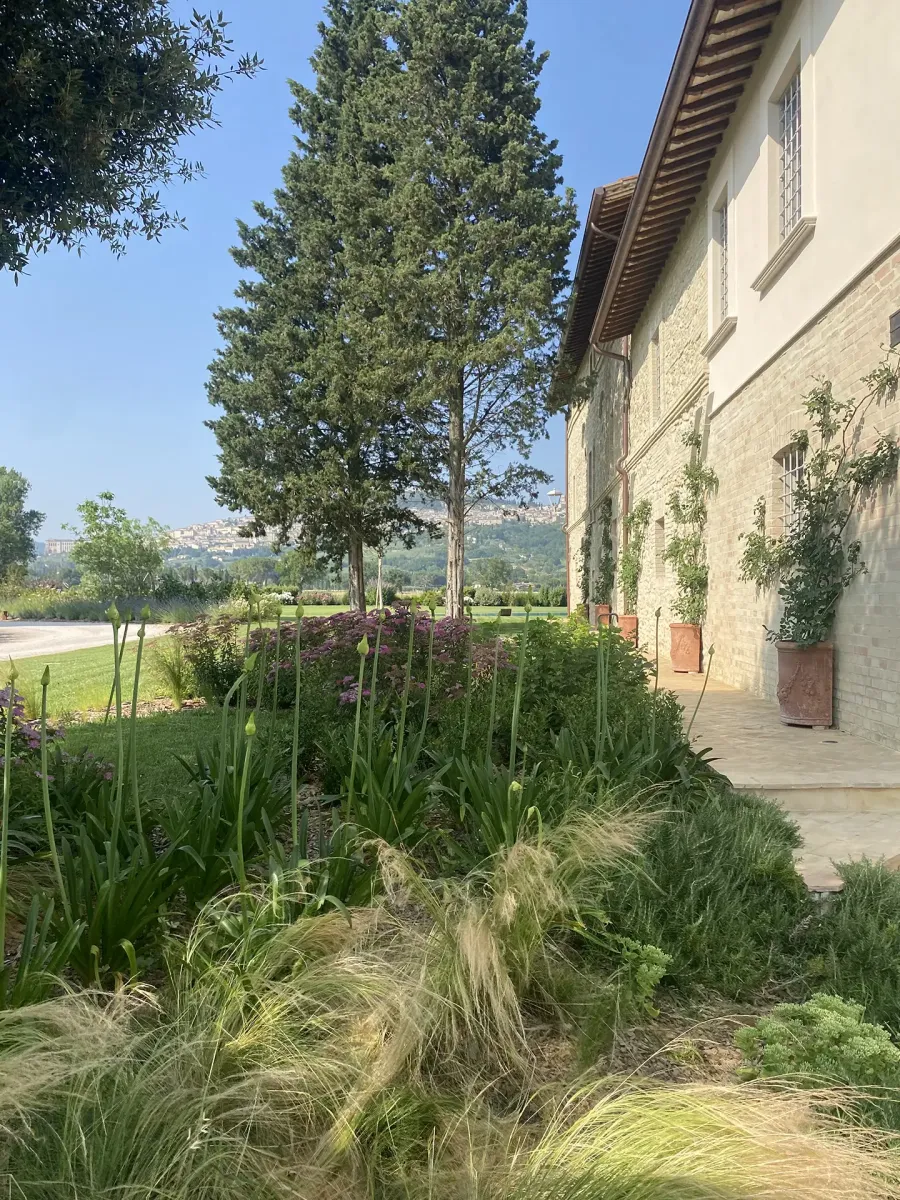 Attorno agli edifici principali si distende un ampio prato verde, definito da due diverse tipologie di siepi che ne articolano la percezione: una, più compatta e composta esclusivamente da specie arbustive, accompagna con leggerezza lo sguardo verso Assisi; l’altra, arricchita da elementi arborei, introduce verticalità e attenua in modo naturale la vista sulla campagna circostante. Le essenze selezionate, tra cui Eleagnus ebbingei, Viburnum tinus, rose paesaggistiche, Arbutus unedo, Cotinus coggygria e Teucrium fruticans, assicurano un susseguirsi di colori, forme e profumi lungo l’intero arco dell’anno.