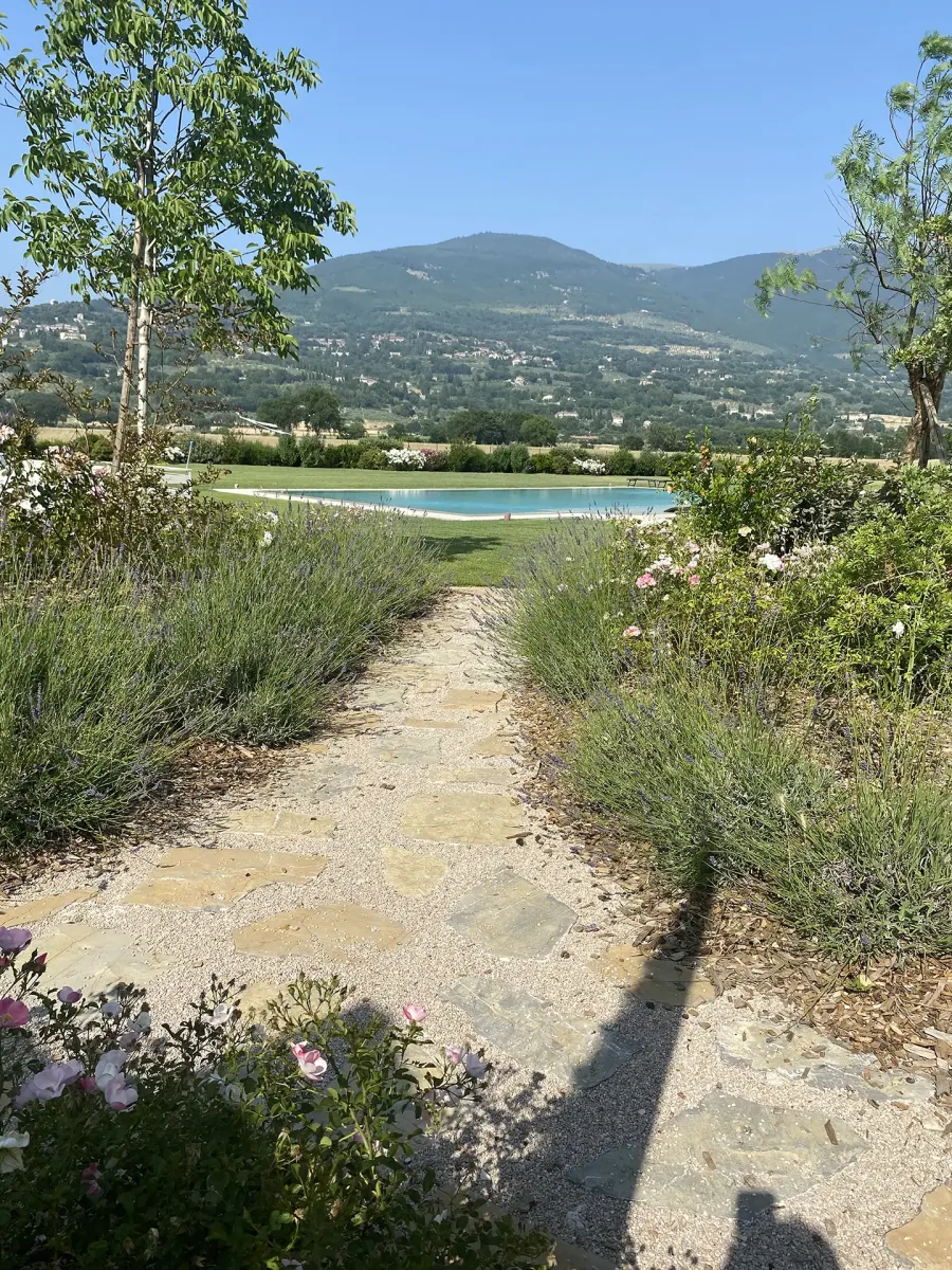 Un parco privato con prati, siepi, orti e viali accompagna lo sguardo verso Assisi
